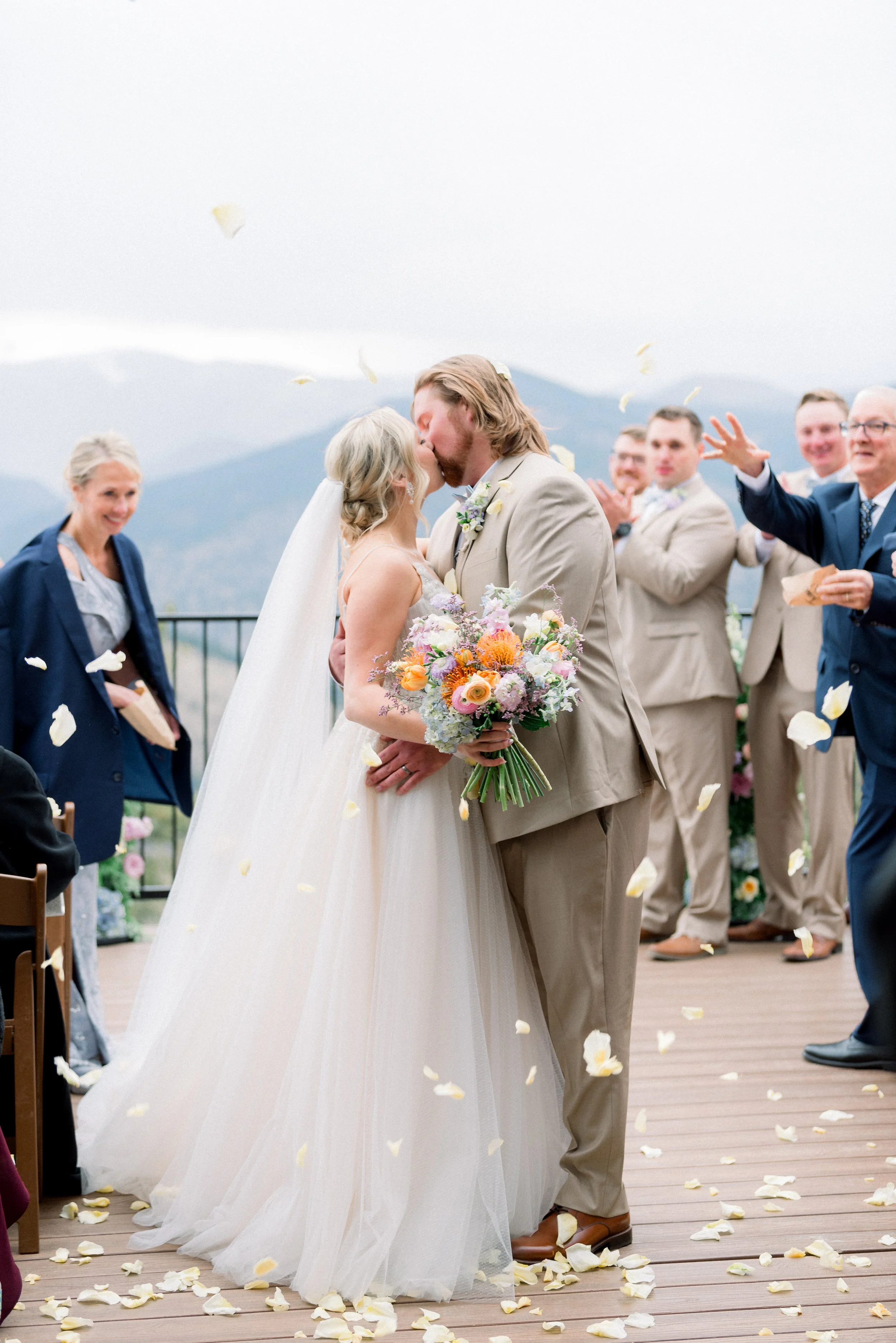 The day began early with clouds overhead, and as I arrived at North Star Gatherings, I could already feel the cool breeze and see the dark clouds gathering in the sky. The team and I quickly went to work setting up, knowing that the ceremony was scheduled for the beautiful outdoor space at the venue, with the Colorado mountains serving as the backdrop. The forecast wasn’t promising, but we remained hopeful, and Meghen and Taylor were determined to have their ceremony outdoors, rain or shine.